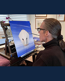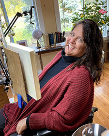 Sara Jane, an avid textile artist, was paralyzed from the shoulders down in a car accident at twenty. Seeking an outlet, she discovered mouth painting. After passing the bar exam, she took art classes and found a new purpose. Sara Jane joined MFPA as a scholarship recipient in 2009 and was promoted to Associate Member in 2021. She enjoys painting organic forms and is an excellent portraitist. Sara Jane lives with the love of her life, Jimmy, who is hearing impaired, and together they have formed their own special method of communicating.